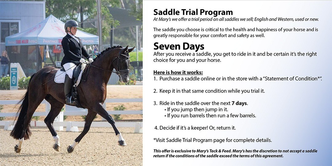 This saddle is eligible for Mary's Saddle Trial Program. Try it before you commit to buying it - we know that the proper saddle fit is important for both the horse and rider. Please look over the details of Mary's Saddle Trial Program and let us know if you have any questions!